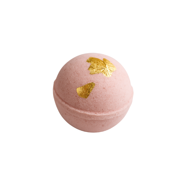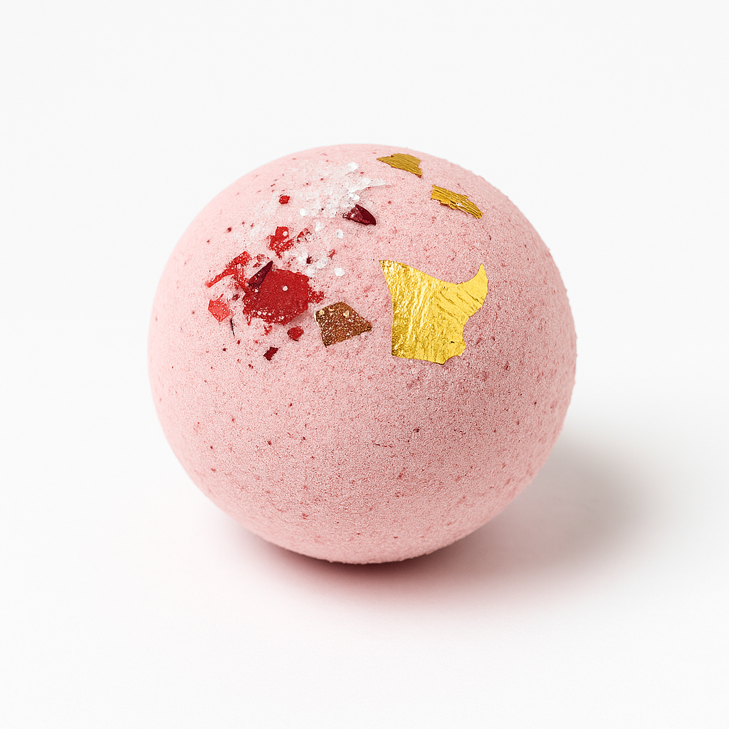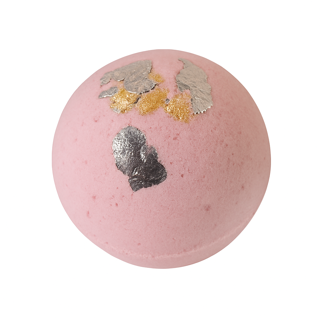 Handcrafted Luxe Bath Bombs topped with rose petals and gold/silver leaf. Each one is a surprise fragrance and design — luxury fizz with every soak.